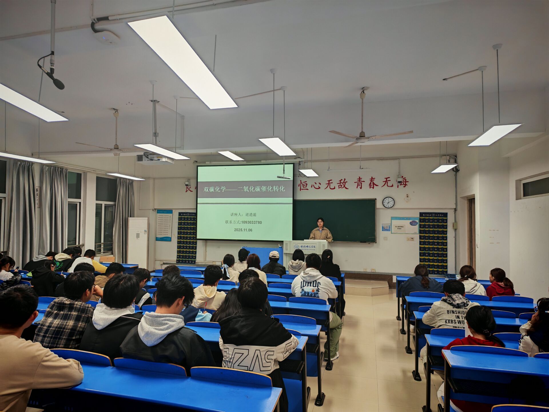 本网讯 11月6日下午,6776永利集团教师道逍遥博士在锦绣校区逸夫楼A306举行了一场题为“双碳化学——二氧化碳催化转化”的学术报告。化学等相关专业学生聆听了报告。