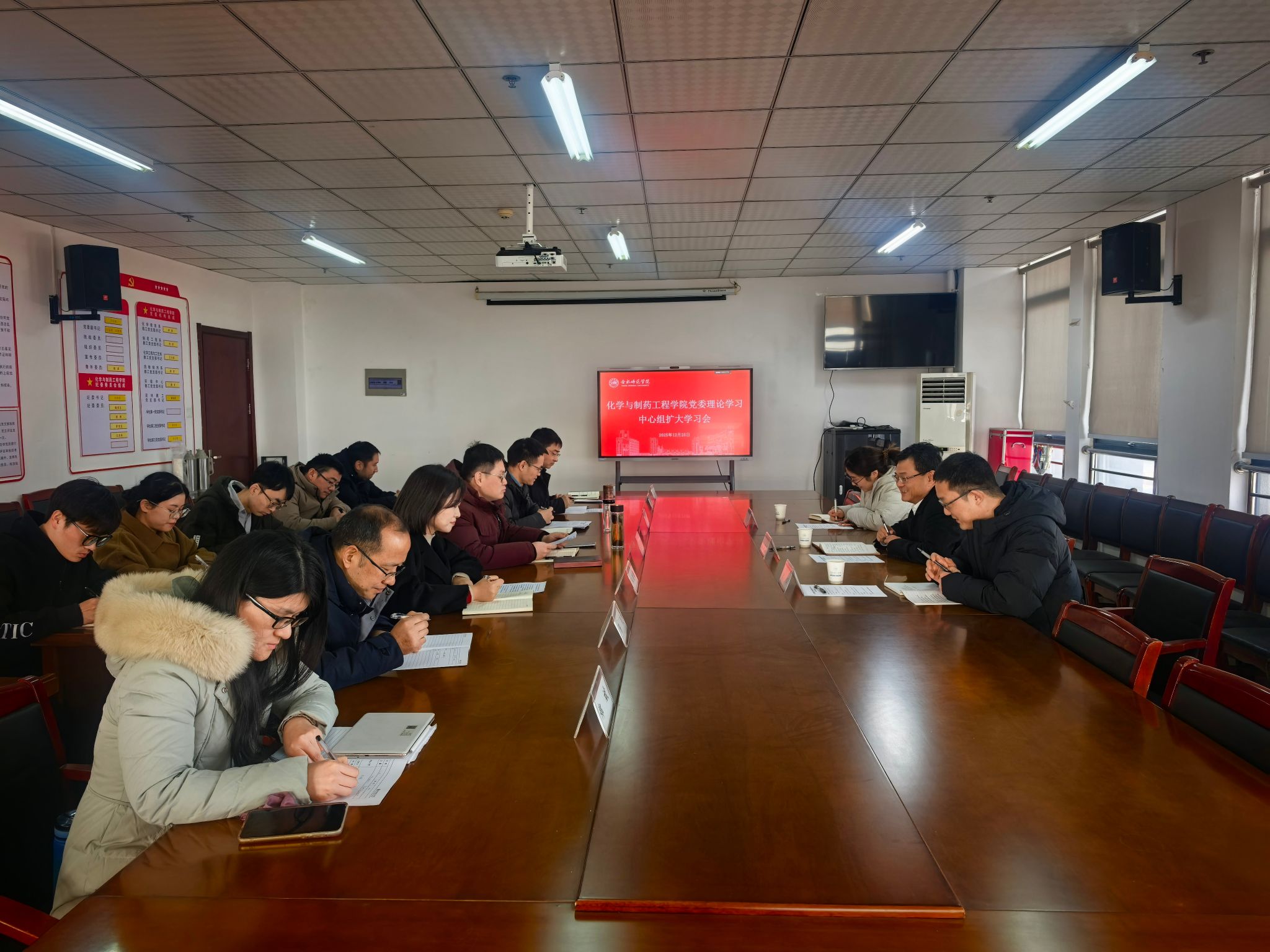 本网讯 为深入学习贯彻习近平新时代中国特色社会主义思想,全面落实新时代党的建设总要求,切实提升二级党组织理论学习中心组学习的规范性、实效性和针对性。12月25日上午,院党委召开理论学习中心组扩大学习会。校党委委员、副校长、组织部部长赵帮恚在组织部副部长余军,组织部秘书、组织科科长张瑜婷陪同下列席旁听。学院全体党委委员、党支部书记参加会议。院党委书记刁文彬主持会议。
